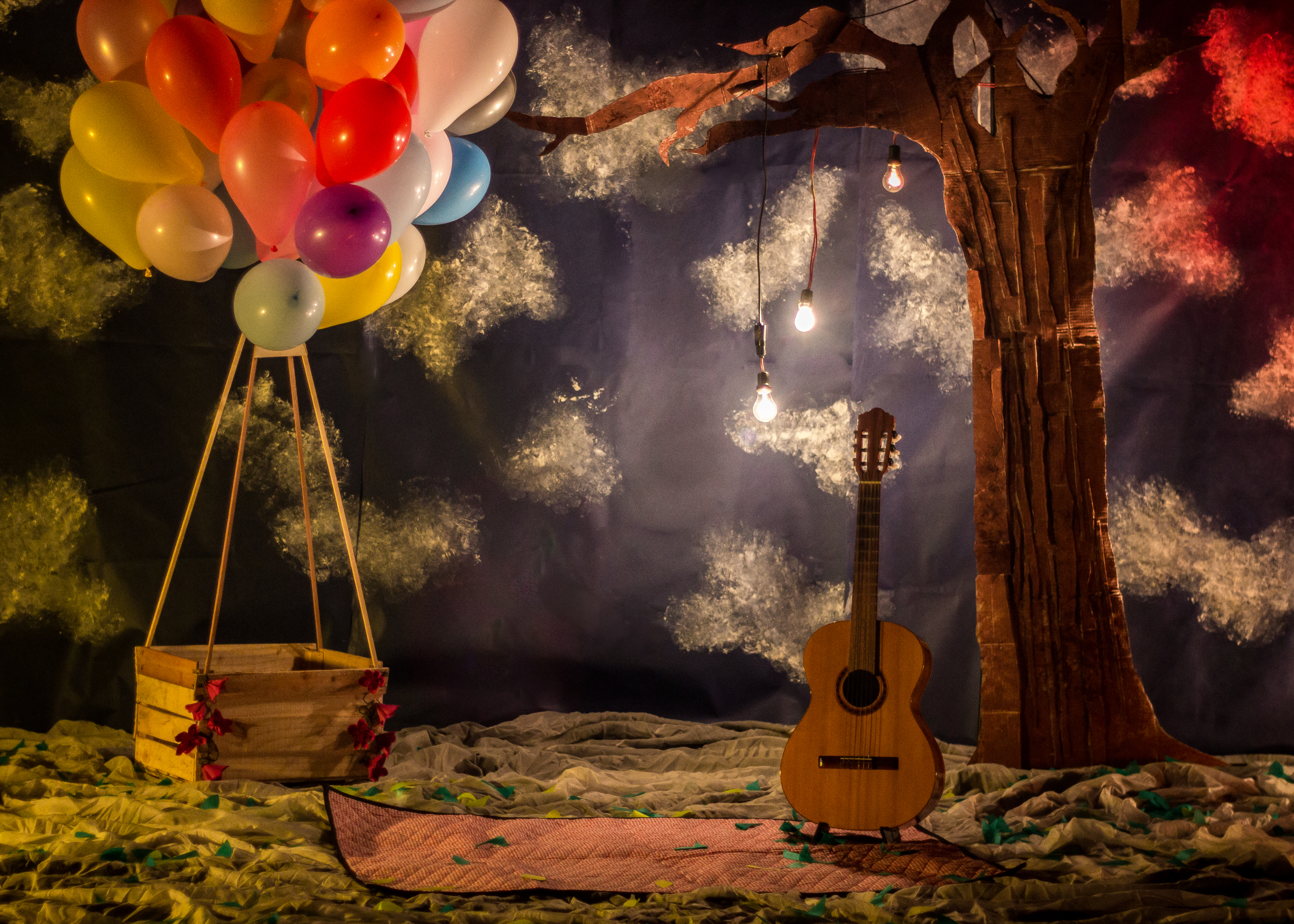 The objective was to design a light and delightful place that would remember that style of music. The guitar makes a right reference to the song. The air balloon reminds us Clarice Falcão’s song, one of ‘Nova MPB’ artists, ‘What makes you happy?’. In the same time it translates the flight of the ‘MPB’ to the ‘Nova MPB’ and it also relates to the freedom feelings. The environment replaces the eventide.